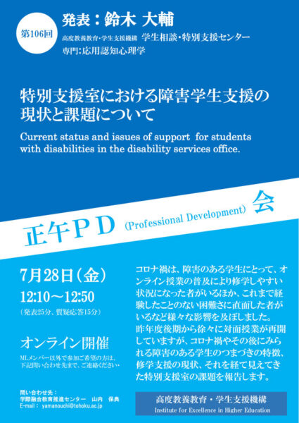 【7/28開催】第106回正午PD会「特別支援室における障害学生支援の現状と課題について」
