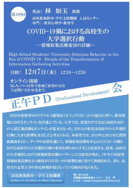 【12/7開催】第109回正午PD会「COVID-19禍における高校生の大学選択行動 ―情報収集活動変容の詳細―」